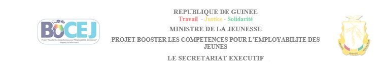 - Secrétariat Exécutif du Projet Booster les Compétences et l’Employabilité des Jeunes (BoCEJ) immeuble Katex, 4e étage appartement A8, Quartier Almamya, commune de Kaloum, près du siège de Cellcom Guinée, Conakry, République de Guinée.