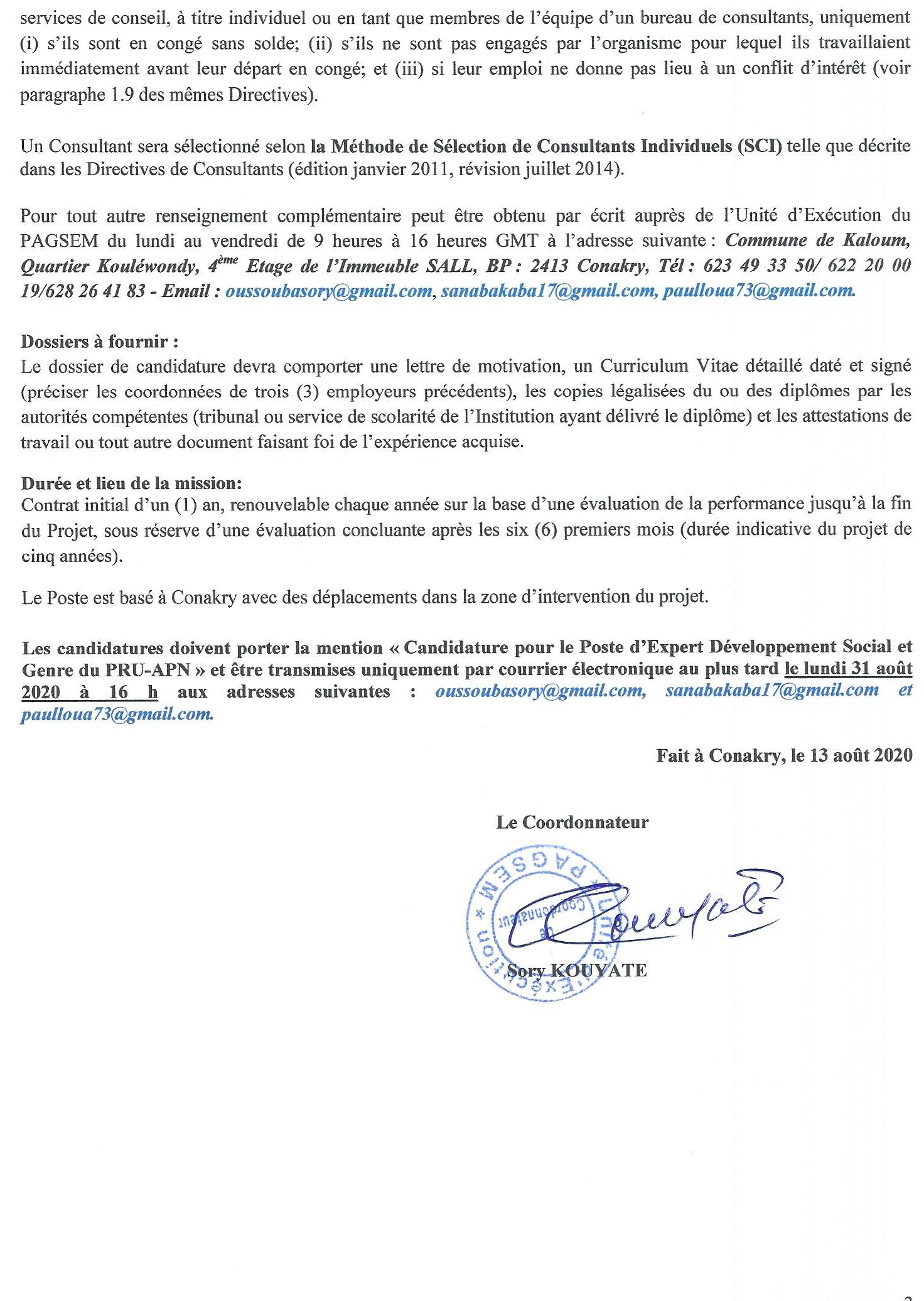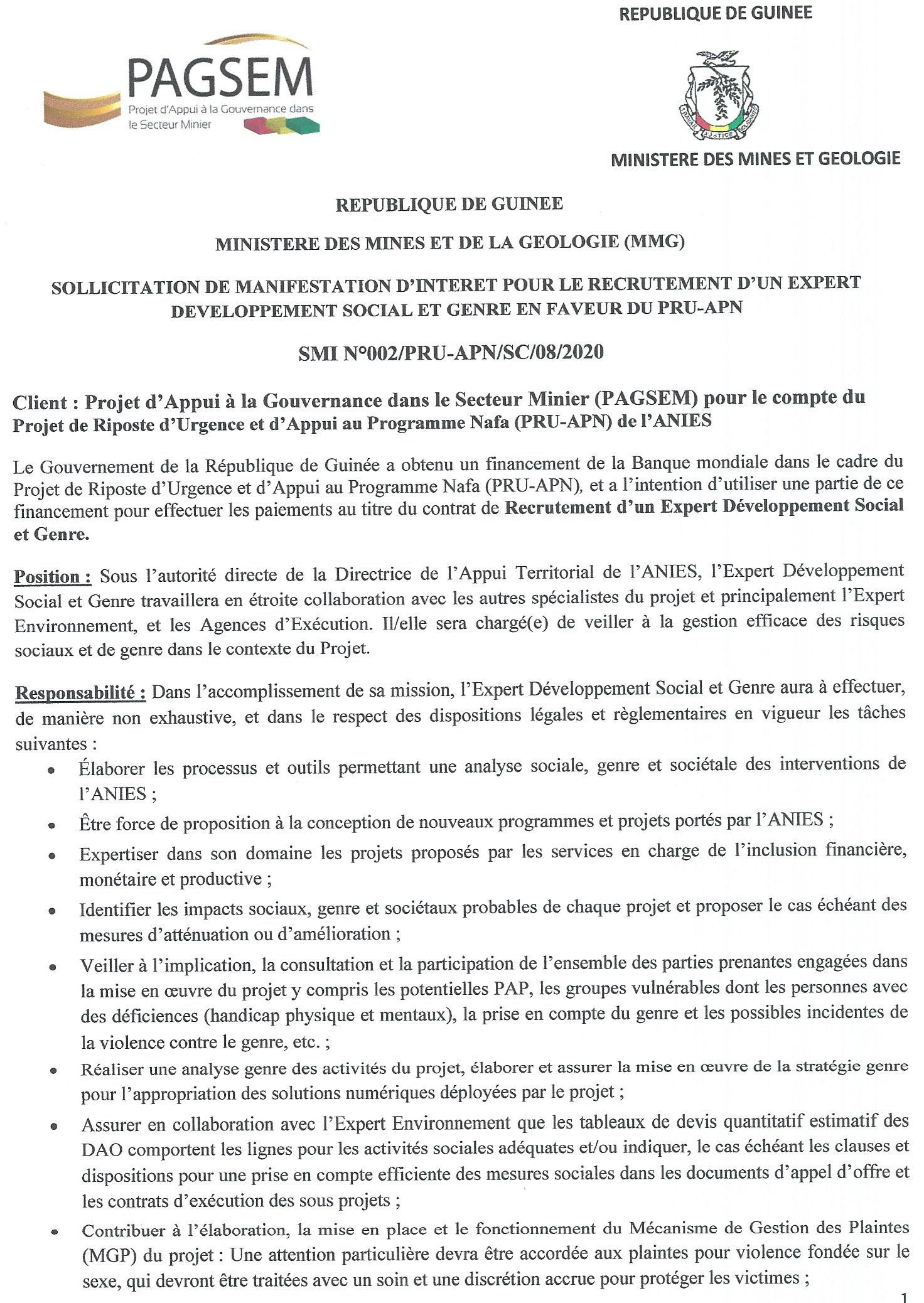 Publié le 17 août 2020 Recruteur : PAGSEM Type de Contrat : cdi Lieu : Conakry Date limite : 31/08/2020 Recrutement d'Un Expert de Développement Social et Genre