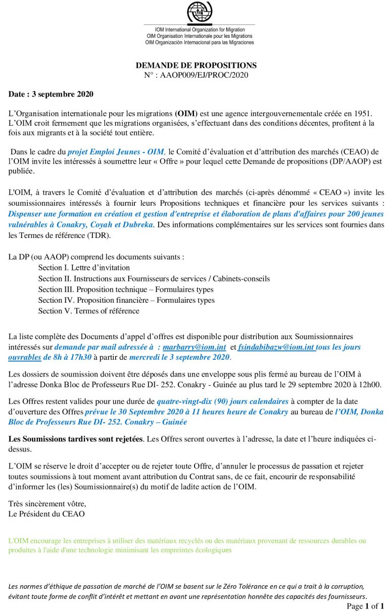 Appel d'Offre pour Propositions techniques et financière pour Dispenser une formation en création et gestion d’entreprise et élaboration de plans d’affaires pour 200 jeunes vulnérables à Conakry, Coyah et Dub