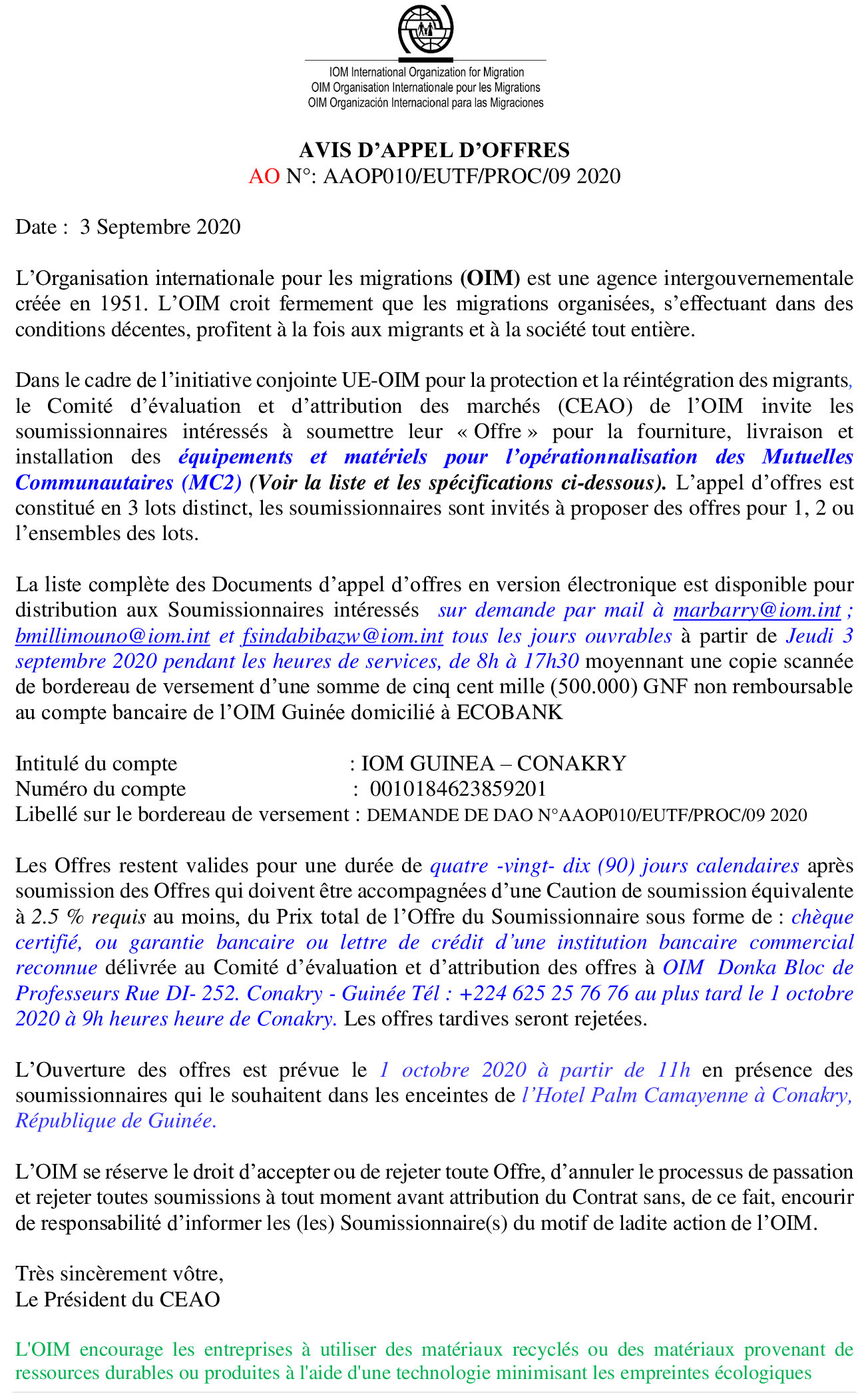 Publié le 3 septembre 2020 Recruteur : OIM Type de Contrat : cdi Lieu : Indéfini Date limite : 01/10/2020 Appel d’Offre pour la fourniture, livraison et installation des équipements et matériels pour l’opérationnalisation des Mutuelles Communautaires (MC2) Télécharger l'Offre complète en PDF