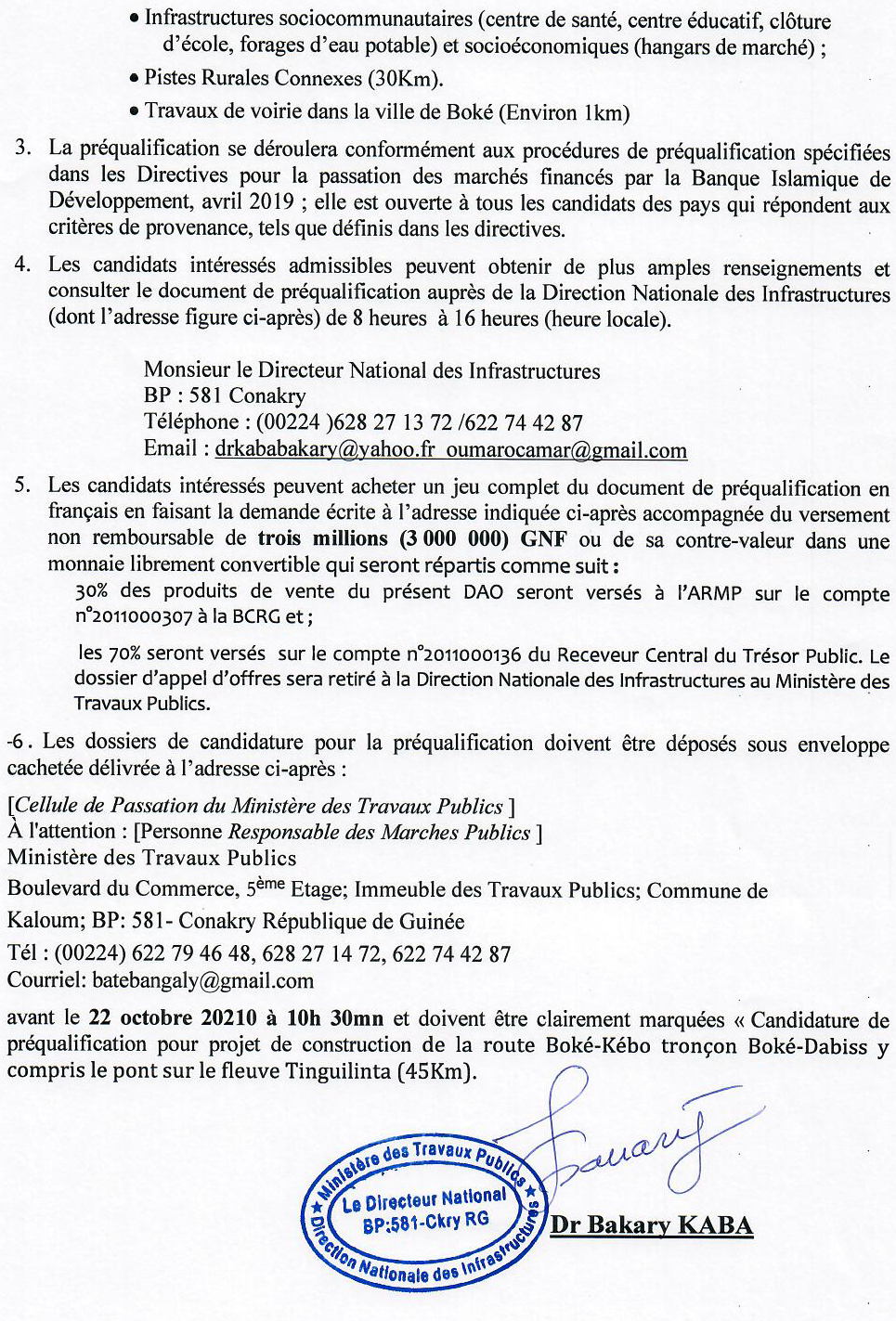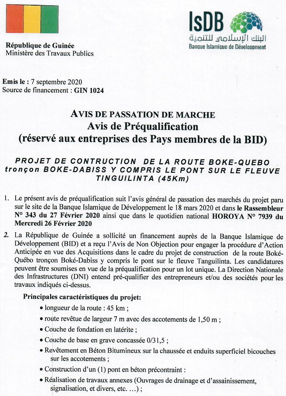 Publié le 7 septembre 2020 Recruteur : Banque Islamique de Développement (IsDB) Type de Contrat : cdi Lieu : Indéfini Date limite : 22/10/2020 Avis de Passation de Marché pour le Projet Construction de la Route Boké-Québo Tronçon Boké-Dabiss