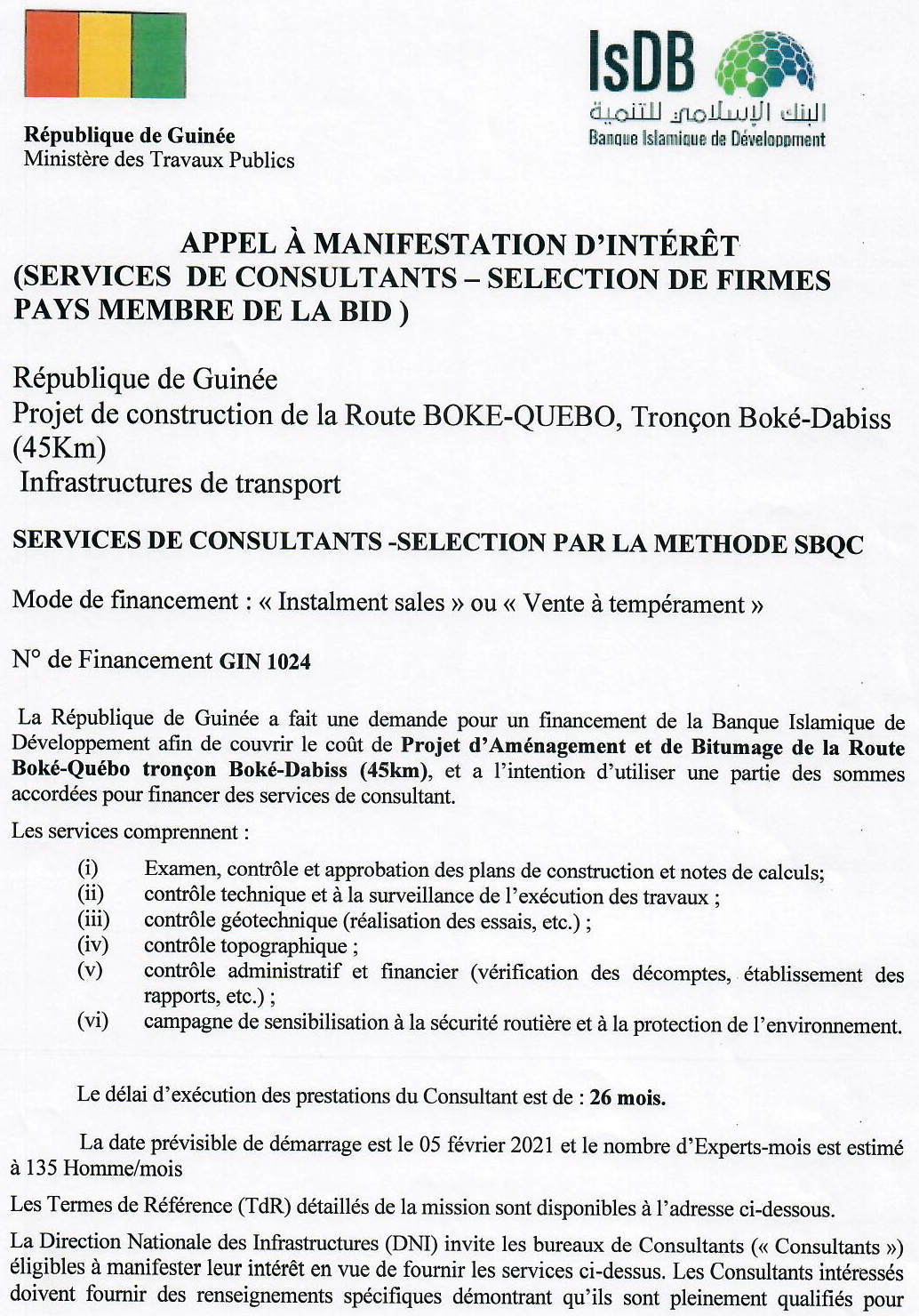 Publié le 7 septembre 2020 Recruteur : Banque Islamique de Développement (IsDB) Type de Contrat : cdi Lieu : Indéfini Date limite : 22/10/2020 Sélection de Firmes Pays Membres de la BID (Services de Consultant - Sélection par la Méthode SBQC)