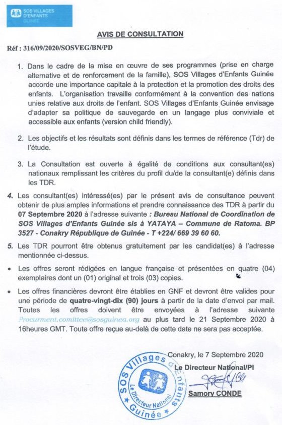 Publié le 9 septembre 2020 Recruteur : SOS Villages d'Enfants Type de Contrat : cdi Lieu : Indéfini Date limite : 21/09/2020 Avis de Consultation (SOS Villages d'Enfants Guinée)