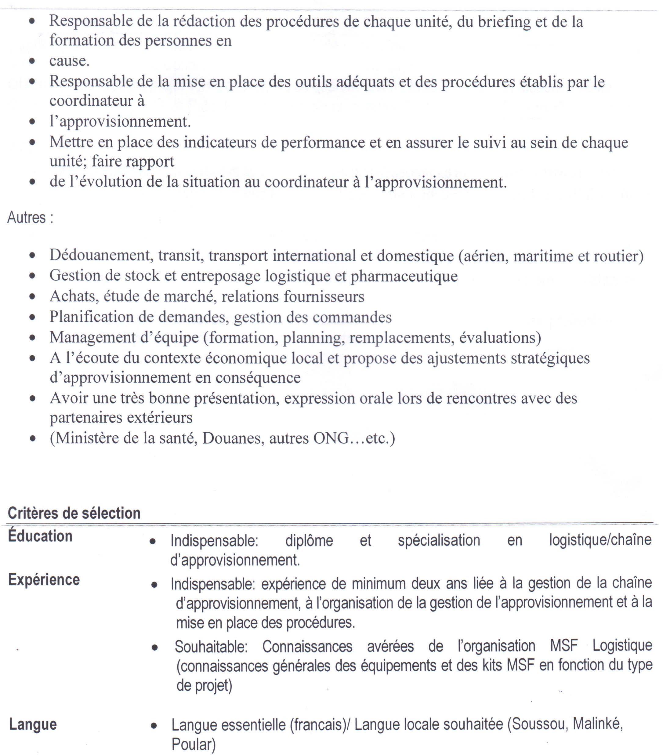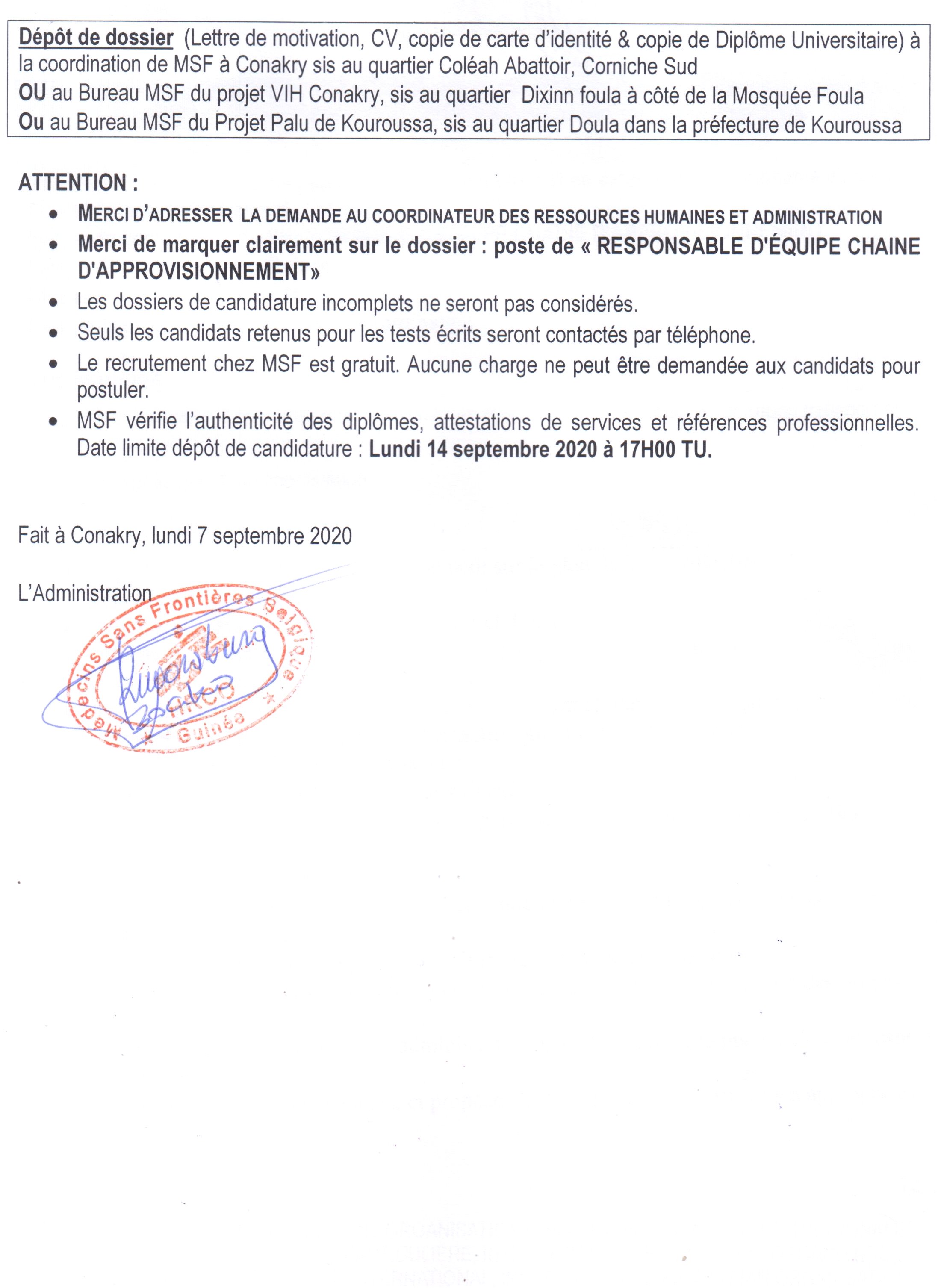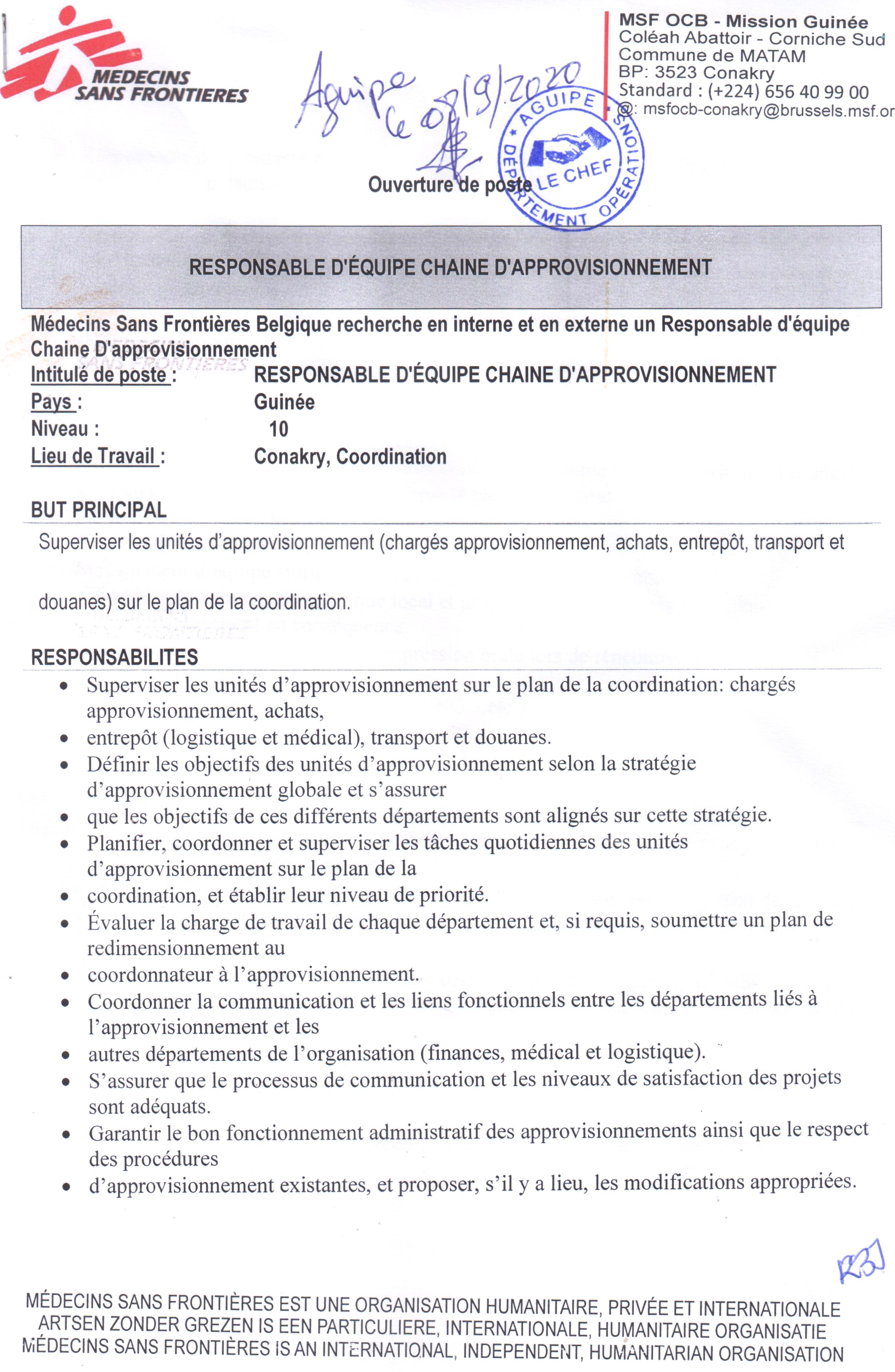 Publié le 10 septembre 2020 Recruteur : Médecins Sans Frontieres (MSF) Type de Contrat : cdi Lieu : Guinée Date limite : 14/09/2020 Recrutement d'Un Responsable d'Equipe Chaine d'Approvisionnement