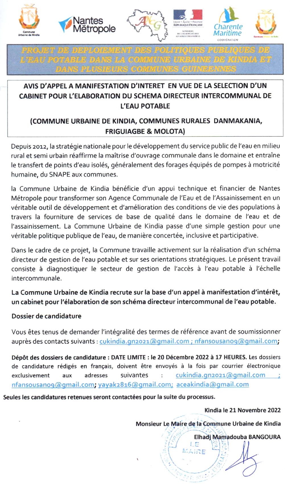 Publié le 25 novembre 2022 Recruteur : Gouvernement Type de Contrat : ... Lieu : Guinée Date limite : 20/12/2022 Sélection D'un Cabinet Pour L'élaboration Du Schéma Directeur Intercommunal De L'eau Potable