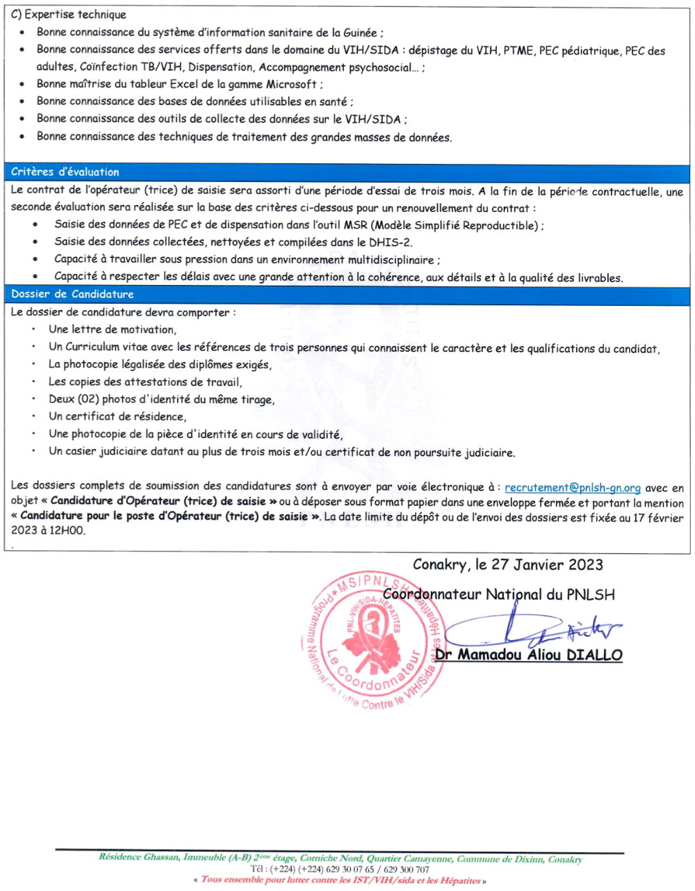 Publié le 30 janvier 2023 Recruteur : PNLS-H Type de Contrat : ... Lieu : Guinée Date limite : 17/02/2023 Recrutement D'un Opérateur(trice) de saisie