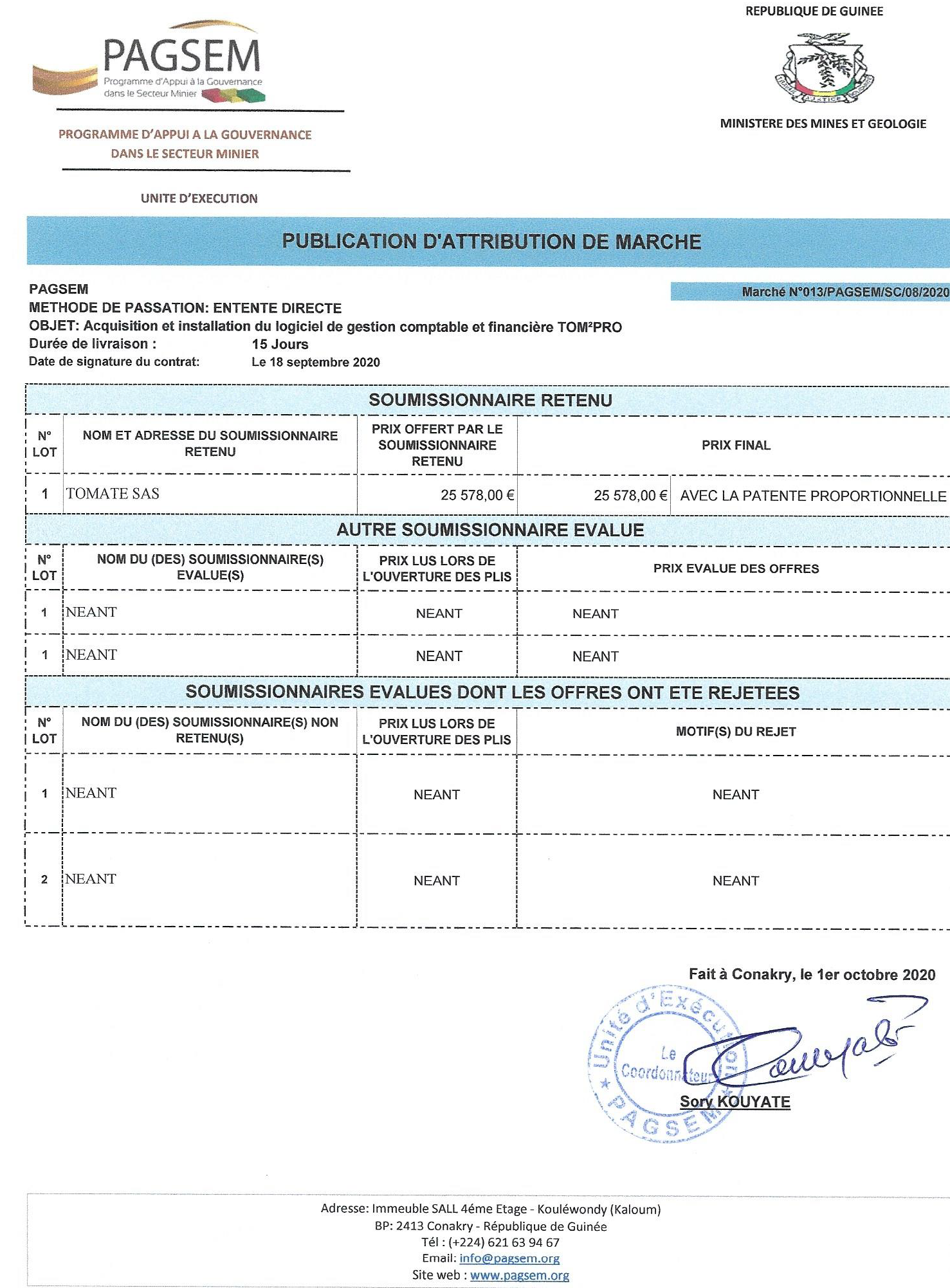 Publié le 4 octobre 2020 Recruteur : PAGSEM Type de Contrat : cdi Lieu : Indéfini Date limite : 01/10/2020 Publication d’Attribution De Marché N° 013/PAGSEM/SC/08/2020