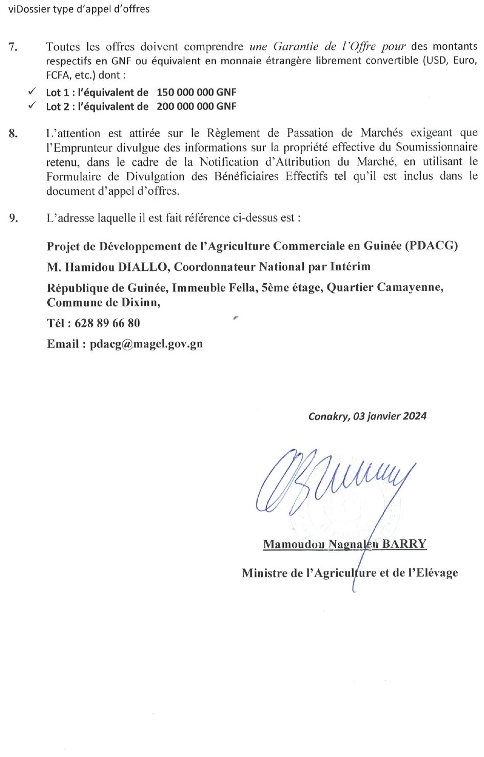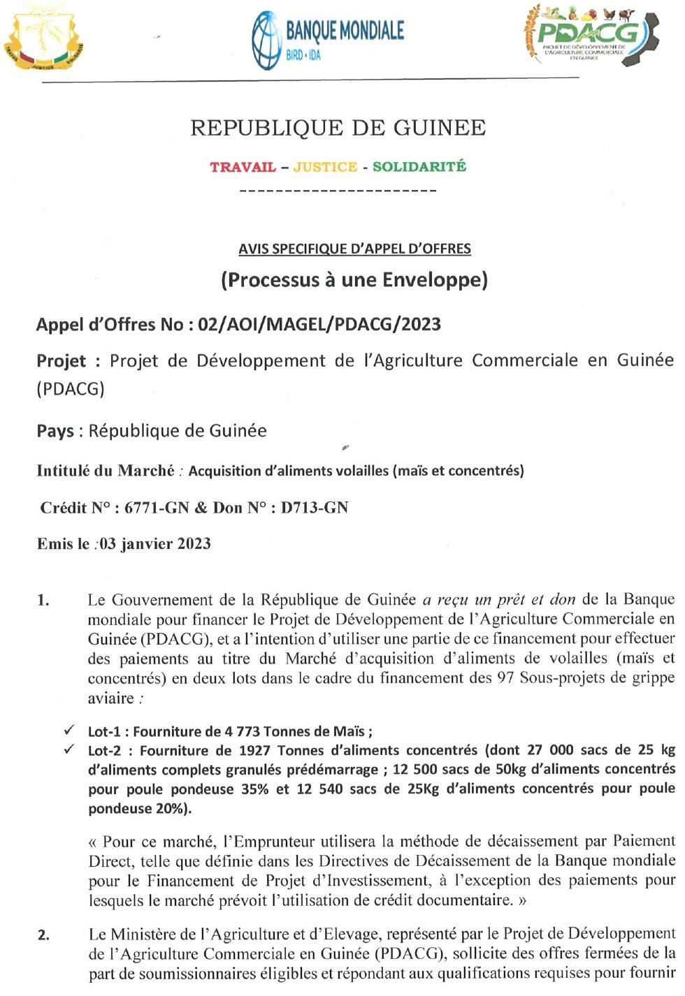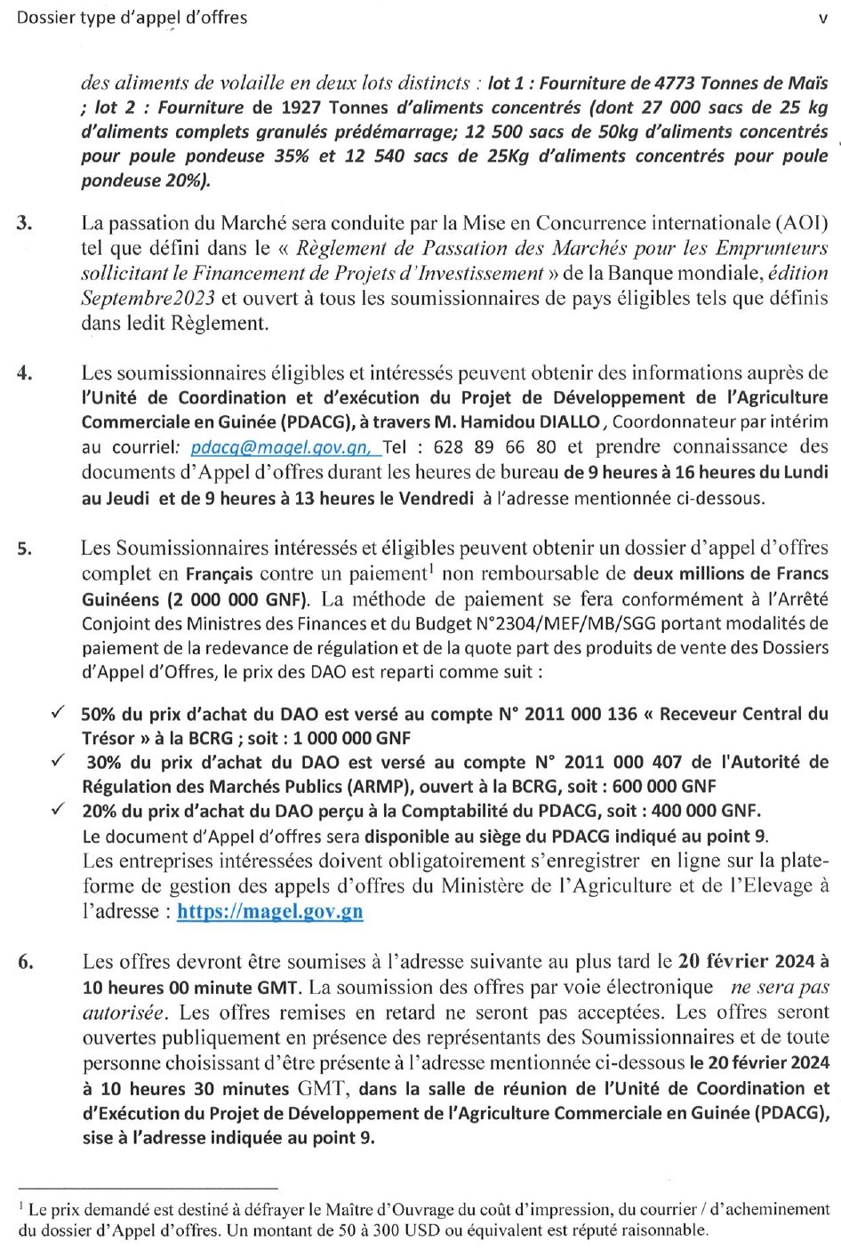 Publié le 5 janvier 2024 Recruteur : PDACG Type de Contrat : ... Lieu : Guinée Date limite : 20/01/2024 Acquisition d’aliments de volailles (maïs et concentrés) en deux lots dans le cadre du financement des 97 Sous-projets de grippe aviaire