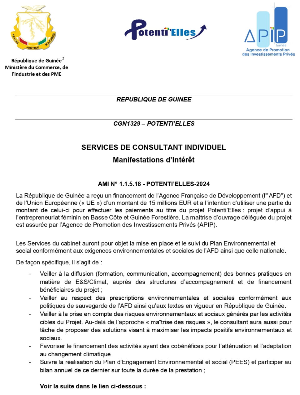 Publié le 17 mai 2024 Recruteur : Potenti'Elles Type de Contrat : cdd Lieu : Guinée Date limite : 10/06/2024 Recrutement d’un consultant pour la mise en place et le suivi du Plan Environnemental et social (E&S) du projet Potenti’Elles https://drive.google.com/file/d/1YR0W1vRAntydjolAWkCAwFEJjiPd97ej/view?usp=sharing