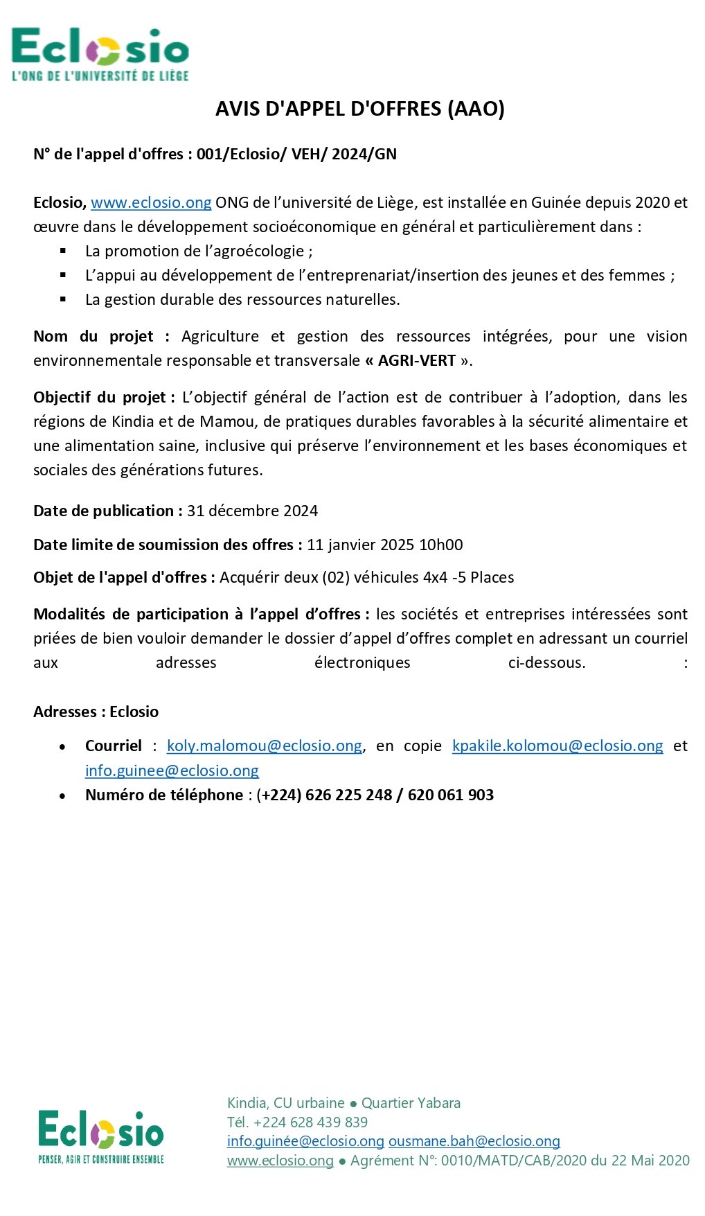 Publié le 31 décembre 2024 Recruteur : Eclosio Type de Contrat : ... Lieu : Guinée Date limite : 11/01/2025 Acquisition de deux (02) véhicules 4x4 -5 Places