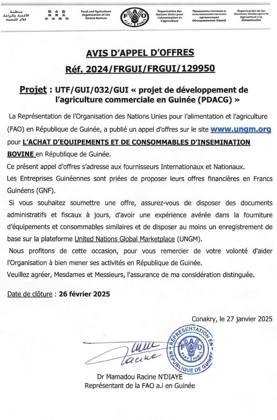 Publié le 30 janvier 2025 Recruteur : FAO Type de Contrat : ... Lieu : Guinée Date limite : 26/02/2025 Achat d'équipement et de sonsommables d'insémination bovine