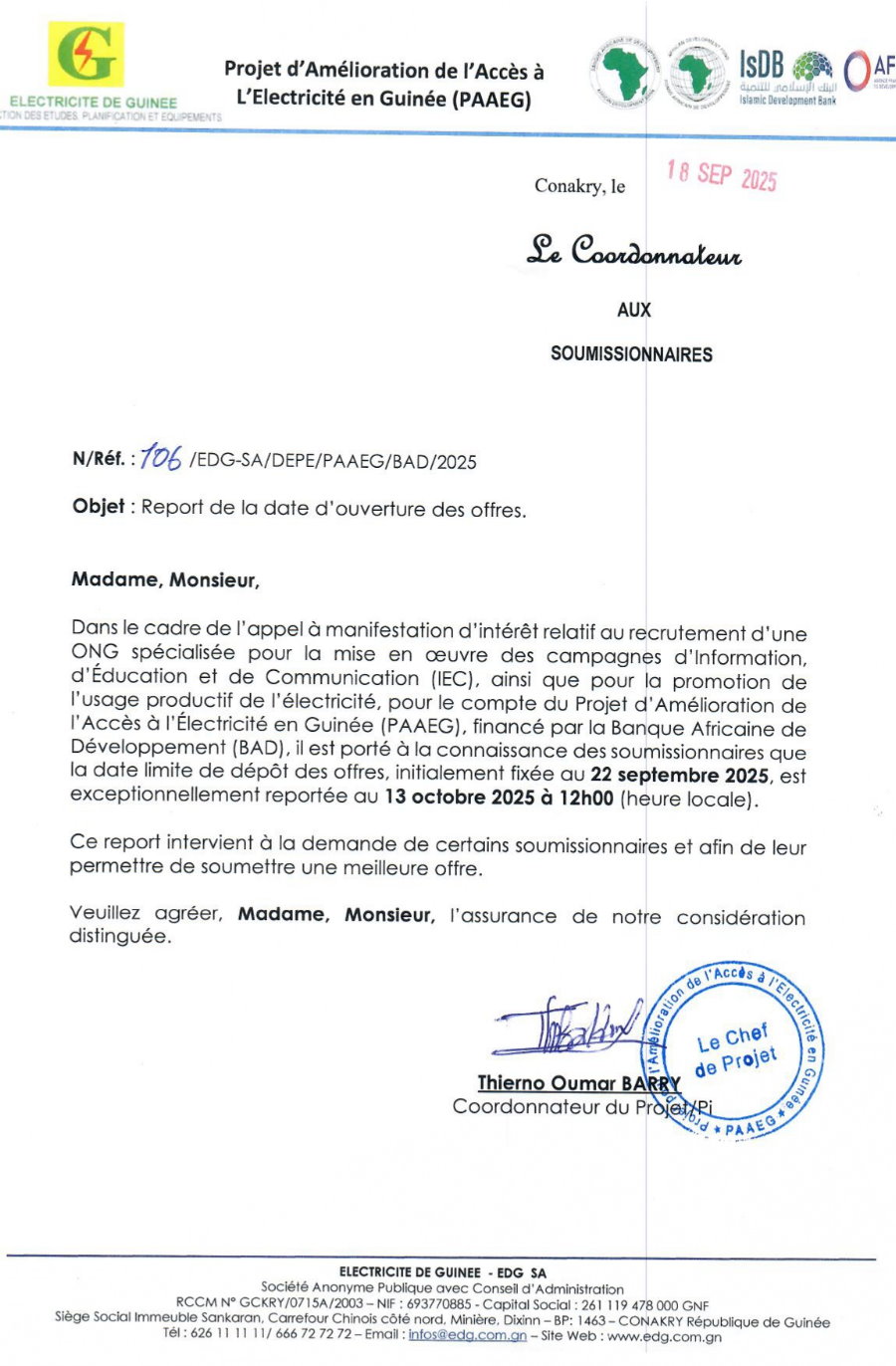 Report de la date d'ouverture des offres: Recrutement d'une ONG spécialisée pour la mise en oeuvre des campagnes d'Information, d'Éducation et de Communication (IEC)