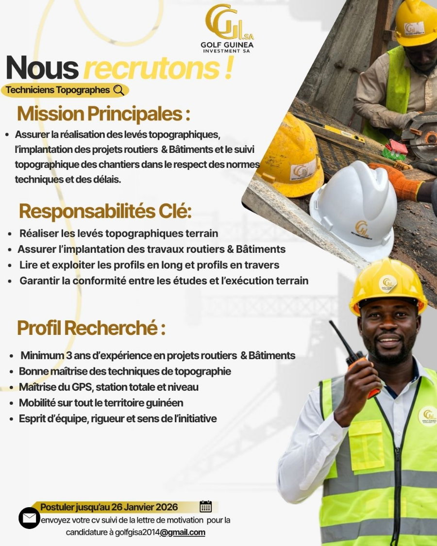 Publié le 14 janvier 2026 Recruteur : GOLF GUINEA INVESTMENT SA Type de Contrat : ... Lieu : Guinée Date limite : 26/01/2026 Recrutement de plusieurs techniciens topographes