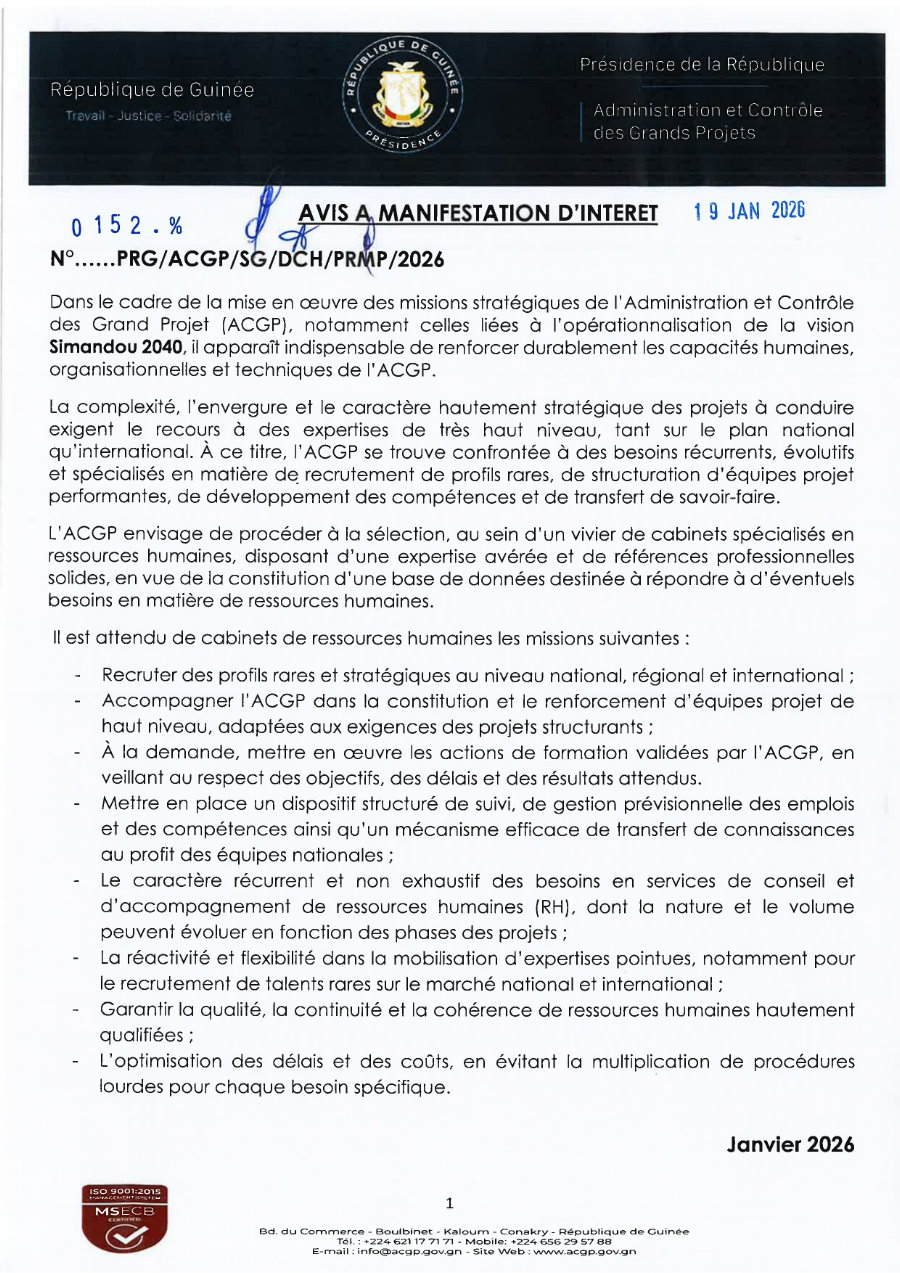 Publié le 19 janvier 2026 Recruteur : ACGP Type de Contrat : ... Lieu : Guinée Date limite : 09/02/2026 Recrutement de cabinets spécialisés en ressources humaines