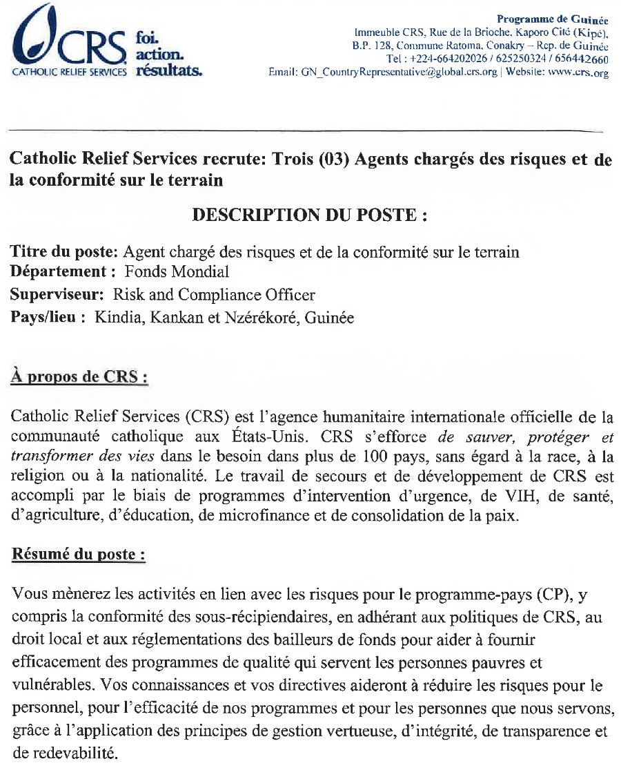 Publié le 5 février 2021 Recruteur : CRS Type de Contrat : cdd Lieu : Kindia, Kankan & Nzérékoré Date limite : 17/02/2021 Recrutement de trois(3) agents chargés des risques et de la conformité sur le terrain Télécharger l'avis complet en Pdf